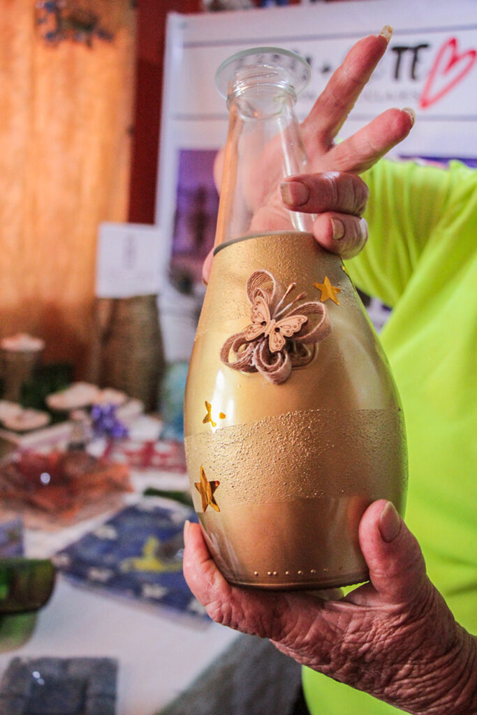 Pero para hacer ese trabajo de corte de botellas, debían contar con alguna herramienta especial para lograrlo. “Hicimos una máquina artesanal que está atrás de la casa (en el taller) y empezamos con mi esposo a desarrollar la creatividad. Yo soy la de las ideas, la que inventa, a la que se le ocurren locuras con las botellas, hago los moldes y mi viejo me ayuda a ejecutar”, relata.