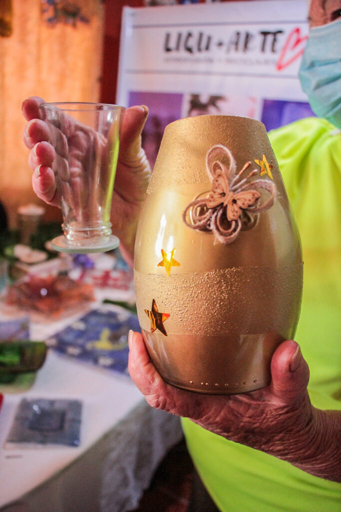 Una lámpara de mesa hecha de una botella de licor y su pantalla solo con papel, es uno de los ejemplo. “También tengo lamparitas mágicas, que ayudan mucho cuando no tienes luz”, muestra Linda. Esta emprendedora utilizó botellas, les hizo un diseño a través de la técnica de la vitrofusión y en su interior, utilizando luces de navidad, hizo un circuito para alumbrar el espacio.