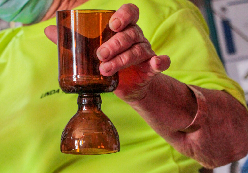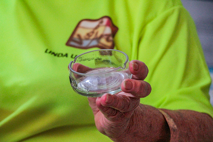 “Nosotros cortamos entre 40 a 50 botellas diarias, a veces 60, incluso a veces salen más. Pero uno dedica más tiempo, porque no solo es cortar, hay que evitar que, mientras voy cortando, no se quiebre, y ahí uno está entre media hora a 45 minutos. Me ocupo de eso en el día, tres horas en la mañana y tres horas en la noche, se me pasa el tiempo en el taller cortando, estoy todo el día haciendo algo, pero siempre usando cosas recicladas”, comenta don Juan.